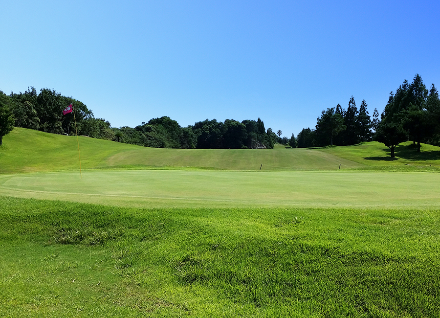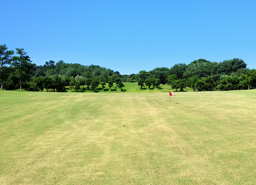 緩やかなミドルホール。グリーン方向が見えないが、正面に見える塔がねらい目。残80Y地点から下りのラフで左右バンカーにも注意!