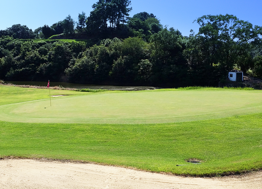 打ち下ろしのショートホール。風向きとガードバンカーに要注意!グリーンはアンジュレーションあり。