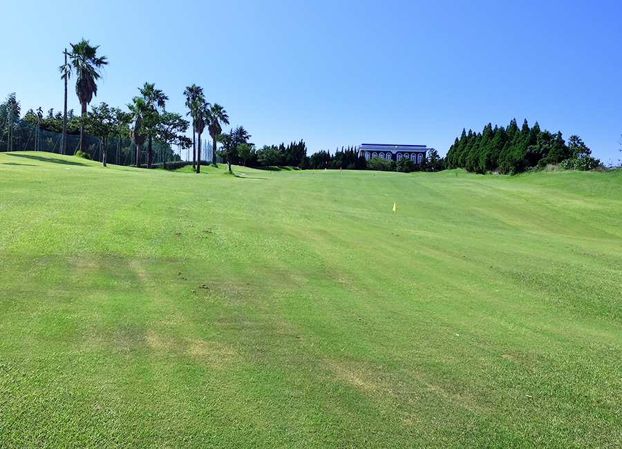 左右OBありの最終ロングホール。ティーショットはフェアウェイ左サイドへ。セカンドも左サイド狙いがベストポジション。