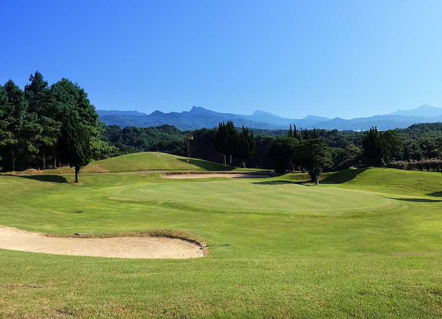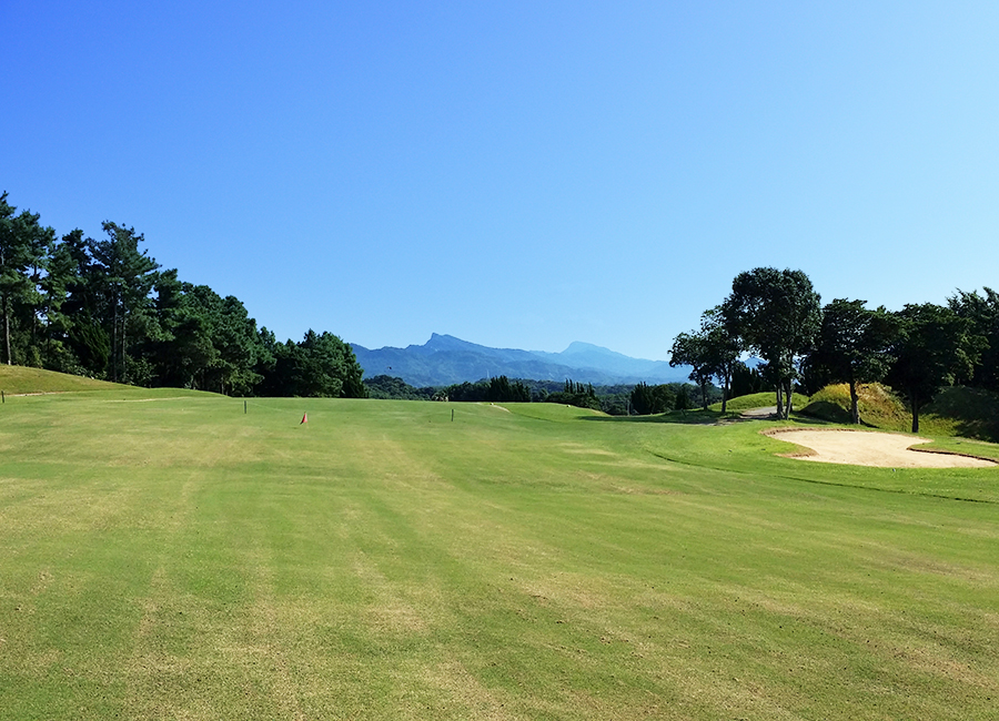 距離の短い右ドッグレッグのミドルホール。グリーン手前残50Y付近から打ち下ろし。ティーショットはフェアウェイキープが必須。