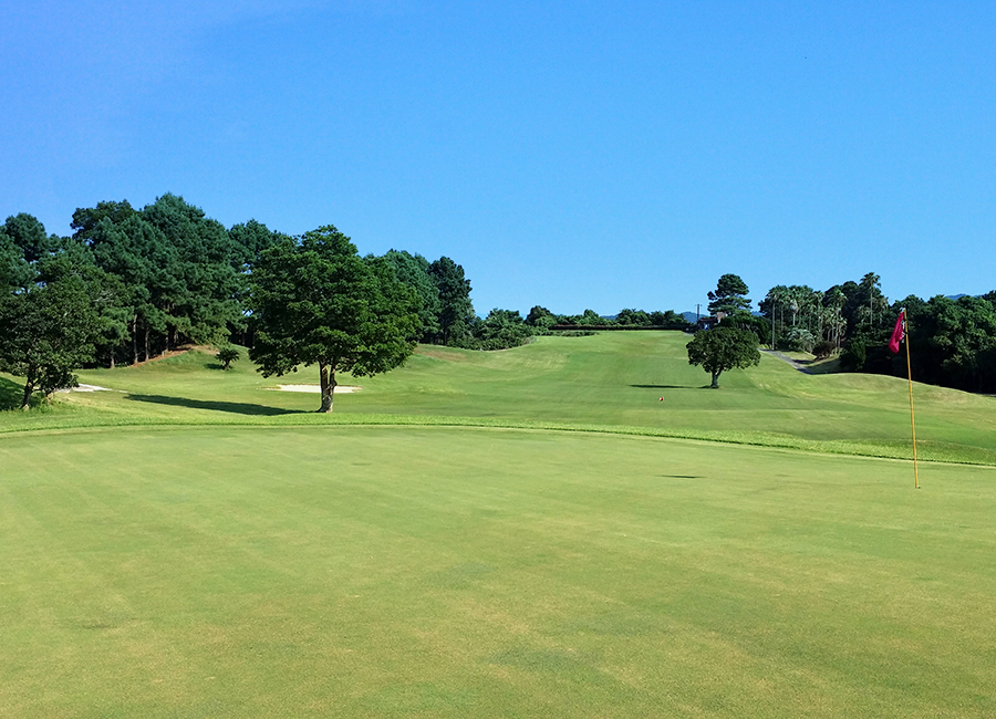 比較的に短いミドルホール。豪快なショットでワンオンも狙えるが残100Y~150Y地点までがラフのため刻みもよし。