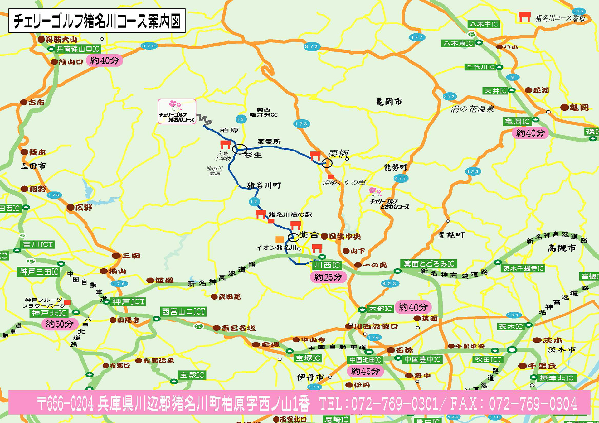 ●阪神高速池田木部ICから国道173号を北上し、栗栖の交差点を左折602号線へ、途中杉生交差点をそのまま直進しコースまで道なり。(約45分)