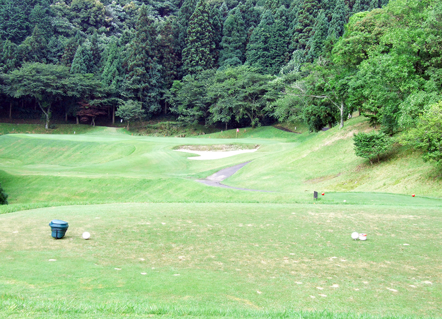 谷越えのショートホール。ショートすると谷に落ち、オーバーすると池に入ります。距離感が非常に大切になります。