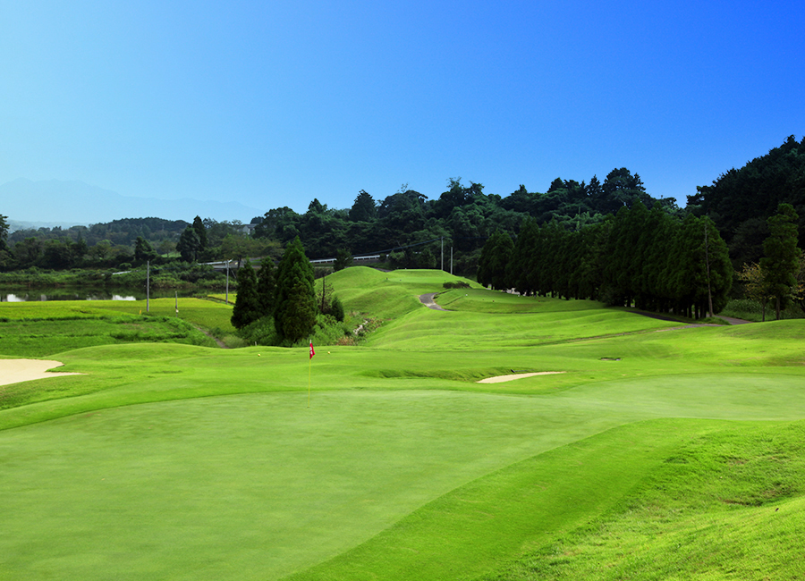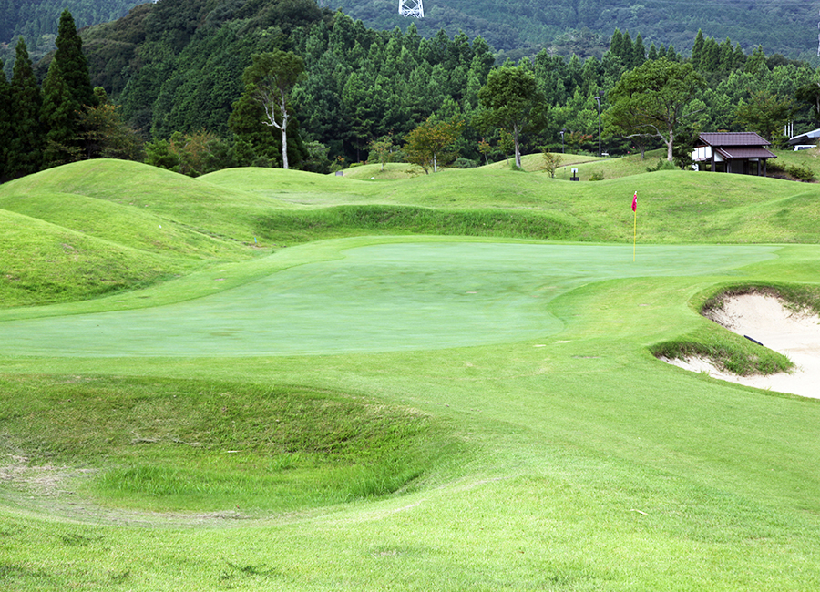 縦に長いグリーンが特徴的で、しかも2段グリーンになっており高低差もかなりのもの。実は若干の打ち上げになっているので距離感注意。