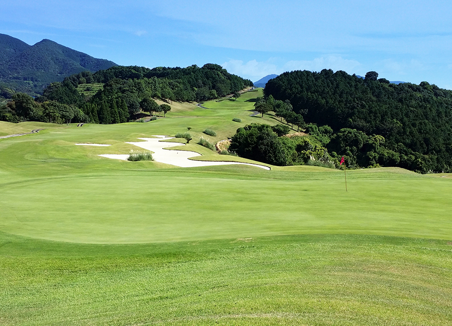 軽い左ドッグレッグの打ち下ろしミドルホール。フェアウェイも狭く絶妙に配置されたバンカーと風に要注意!