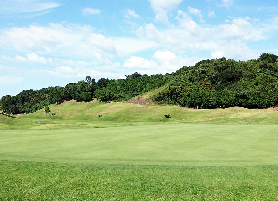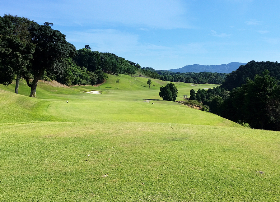 緩やかな右ドッグレッグのロングホール。グリーン奥にはOBも近く、ガードバンカーにも注意!