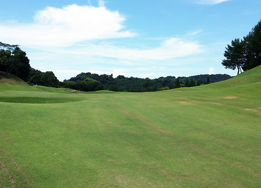 なだらかな打ち上げのミドルホール。正確なティーショットが必須。グリーン奥にはOBラインが迫り要注意!