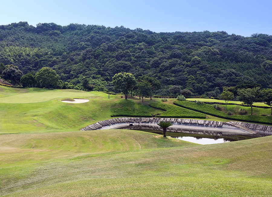 なだらかな打ち下ろしのティショットから始まるミドルホール。セカンドからさらに打ち下ろし。グリーン右手前の池に要注意!