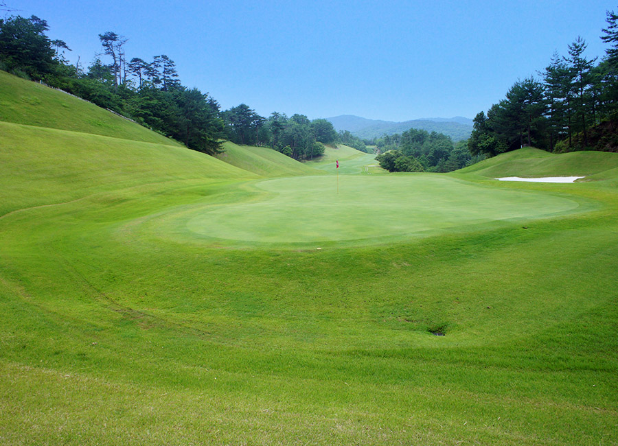1打目は左サイドのOBに注意。3打目は上りの距離感に注意。グリーンは3段。