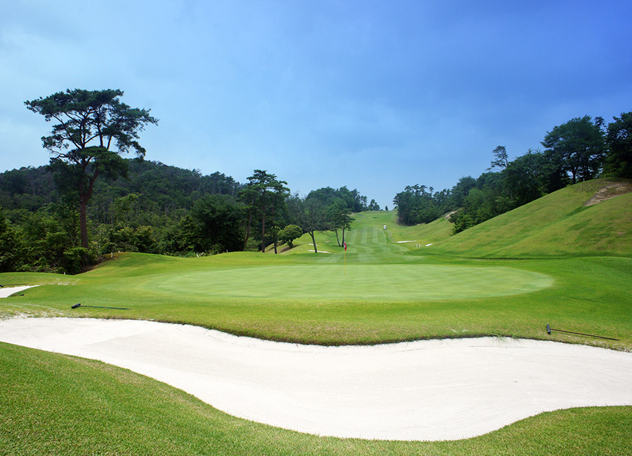 1打目は右サイドのOBに注意。縦長の2段グリーンの為、2打目の距離感に注意。