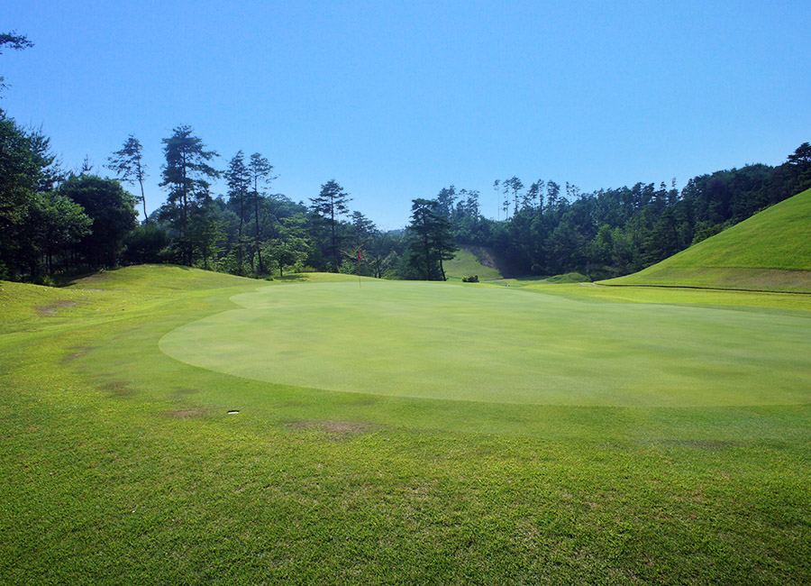 2打目は右サイドのOBに注意。3打目は上りの距離感に注意。縦長の3段グリーン。