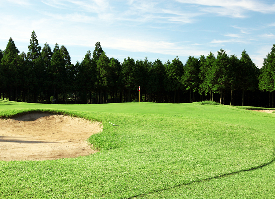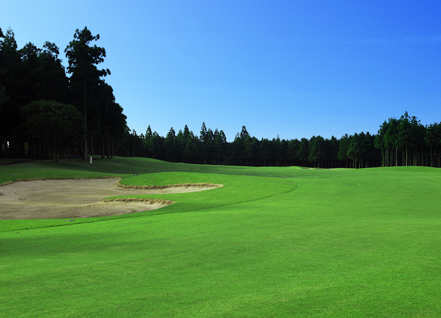 打ち下ろしの左ドッグレッグホール。飛距離に自信のある方は林の上を狙ってショートカットに挑戦してみたらいかがでしょうか。