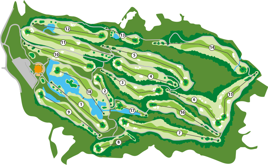 池やクリーク・グラスバンカーを巧みに配置し、フェアウェイは穏やかな曲線の中に起伏がありいつご来場いただいてもプレーヤーを飽きさせないコースとなっています。