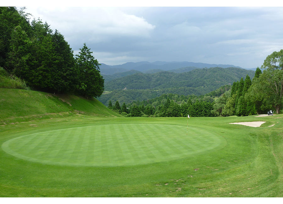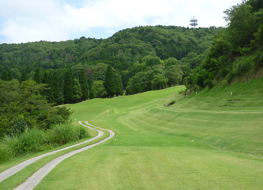 無理せず刻んで真中へ。左側はかなり浅いのでOBに注意。上りが急なのでセカンドは大きめで。