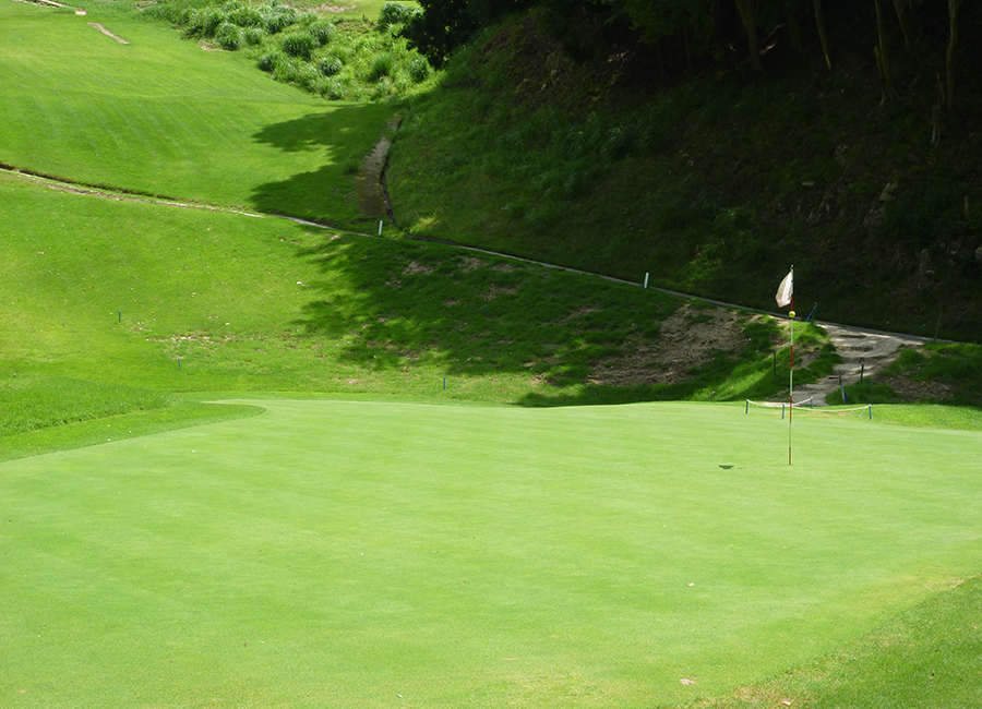 通常の距離より2~3番手短めで手前から攻めてた方が良い。グリーン奥はすぐにOB。