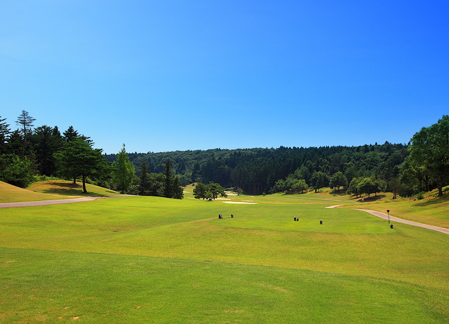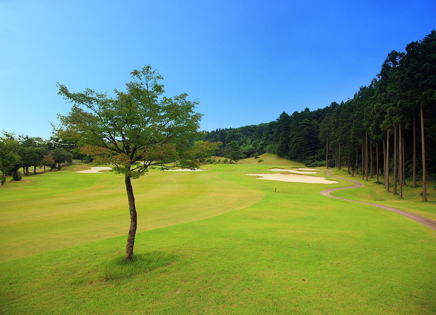 やや左にドッグレックしたロングホール。ティショットは左サイドに注意。